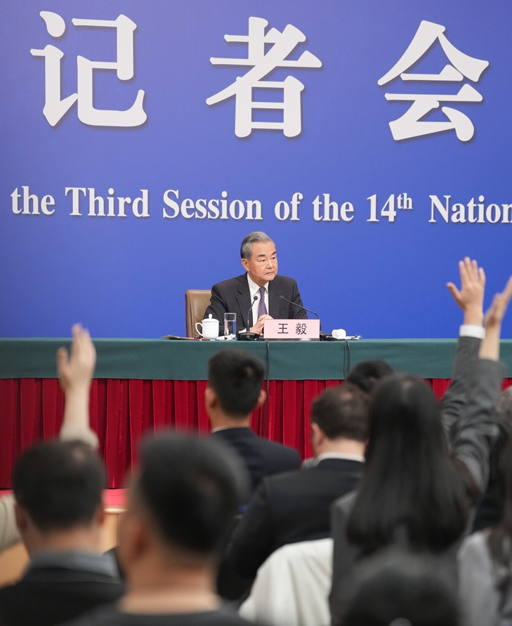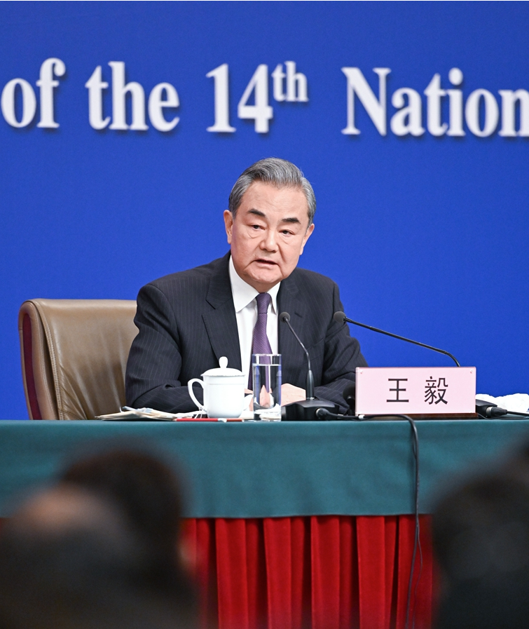 3月7日,十四届全国人大三次会议在北京梅地亚中心新闻发布厅举行记者会。中共中央政治局委员、外交部长王毅就中国外交政策和对外关系回答中外记者提问。 新华社记者 陈晔华 摄