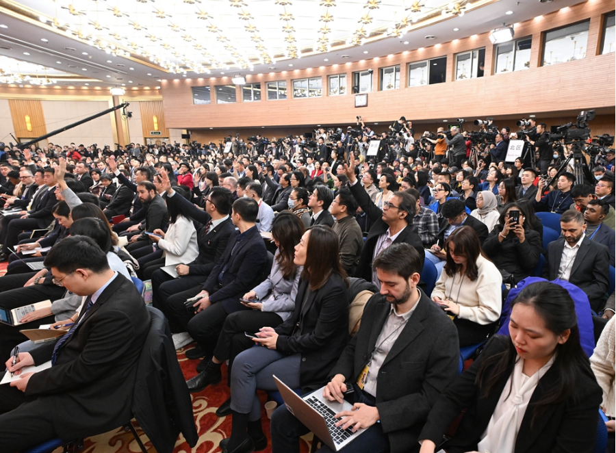 3月7日,十四届全国人大三次会议在北京梅地亚中心新闻发布厅举行记者会。中共中央政治局委员、外交部长王毅就中国外交政策和对外关系回答中外记者提问。这是记者在现场采访。 新华社记者 陈晔华 摄