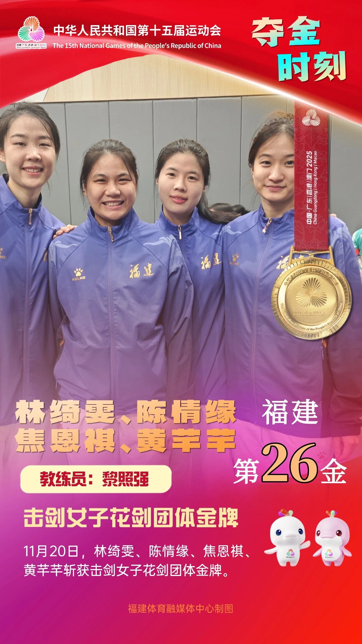 由泉州市输送的运动员林绮雯,1998年5月出生,2014年2月进入省击剑队,2023年全国击剑冠军赛总决赛女花个人第三名,2024年全国击剑锦标赛女花团体金牌,2025年全国击剑冠军赛总决赛暨全运会预赛第二站女花团体金牌、全国击剑锦标赛暨全运会预赛第三站女花个人第二名。