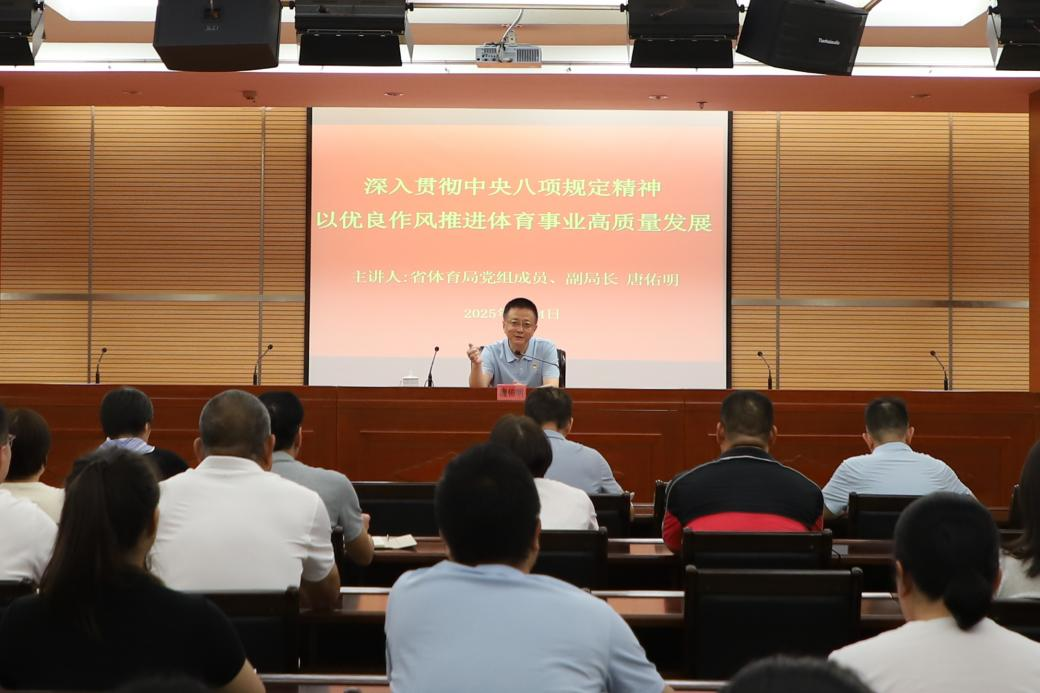 为深入贯彻落实中央八项规定精神,推动体育事业高质量发展,7月4日,省体育局党组成员、副局长唐佑明在省奥林匹克体育中心讲授专题党课,全体干部职工参会学习。党课以“深入贯彻中央八项规定精神,以优良作风推进体育事业高质量发展”为主题,系统部署作风建设工作。