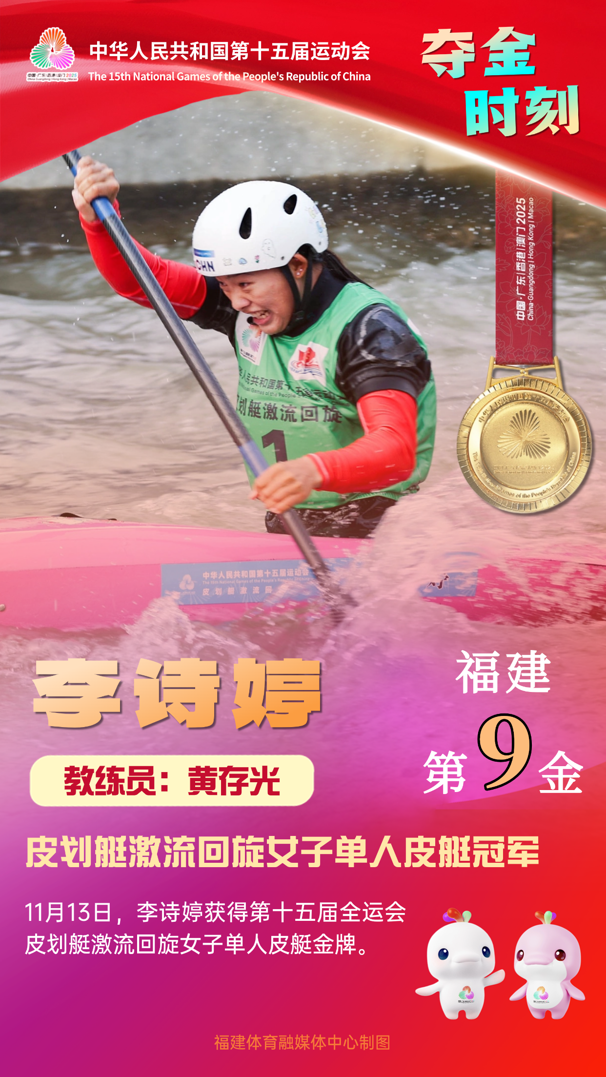 由漳州市输送的运动员李诗婷,2005年11月出生,2019年3月进入省皮划艇队,2024年6月进入国家队,曾获2023年全国皮划艇激流回旋锦标赛女子单人皮艇第三名、第一届全国学生(青年)运动会皮划艇激流回旋女子单人皮艇第二名,2024年全国皮划艇激流回旋春季冠军赛女子单人皮艇团体金牌、个人金牌,2025年新西兰皮划艇激流回旋国际公开赛女子单人皮艇金牌、全国皮划艇激流回旋锦标赛女子单人皮艇金牌。