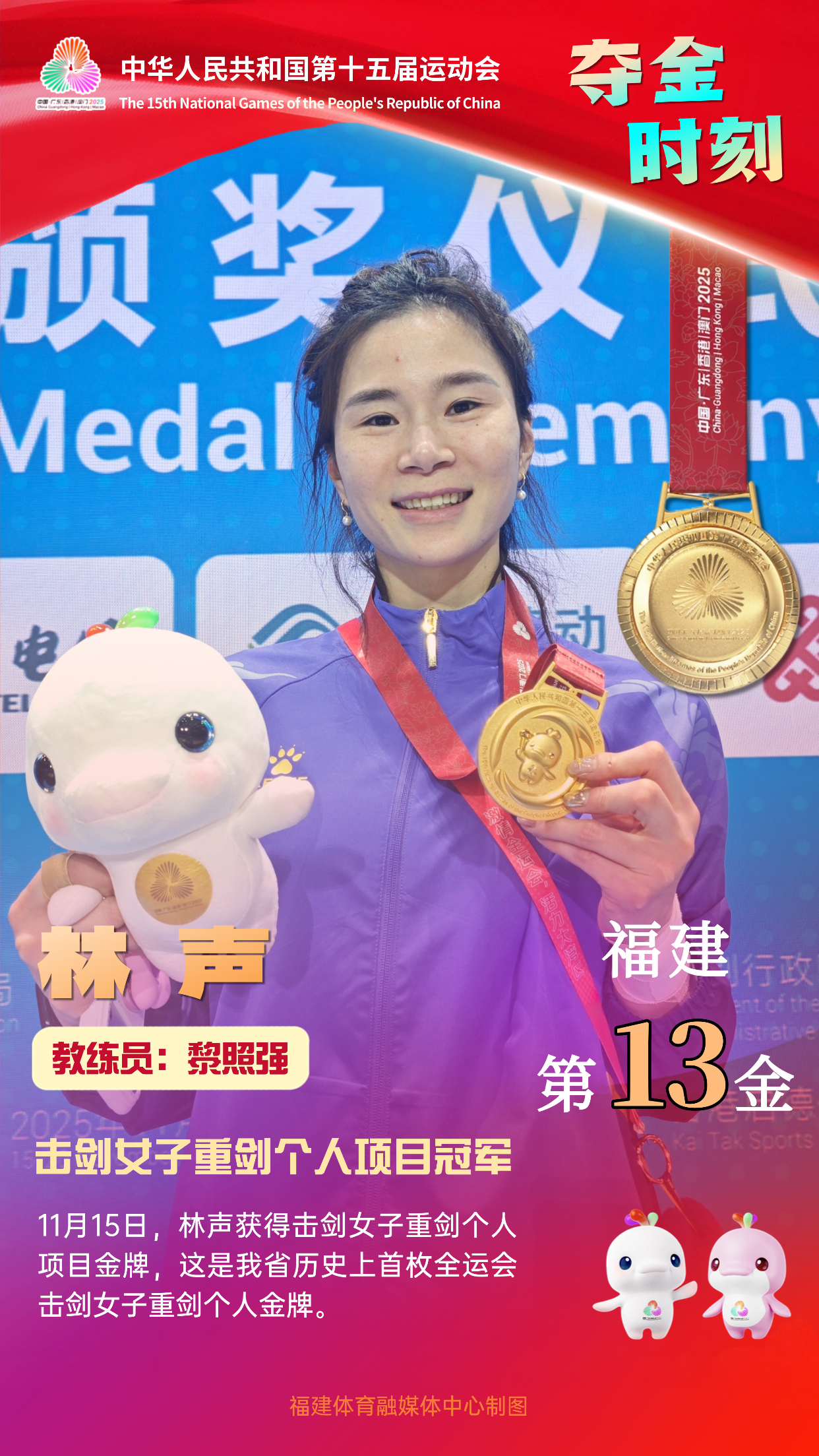 由福州市输送的运动员林声,1994年1月出生,2008年12月进入省击剑队,曾获2018年雅加达亚运会女子重剑团体金牌,2019年世界击剑锦标赛女子重剑团体金牌,2020东京奥运会女子重剑团体第四名,2021年第十四届全运会女子重剑团体金牌、个人第二名,2023年亚洲击剑锦标赛女子重剑团体第三名、个人第三名,2024年全国击剑锦标赛女子重剑第三名,2025年全国击剑冠军赛总决赛女子重剑团体第二名、个人第三名。