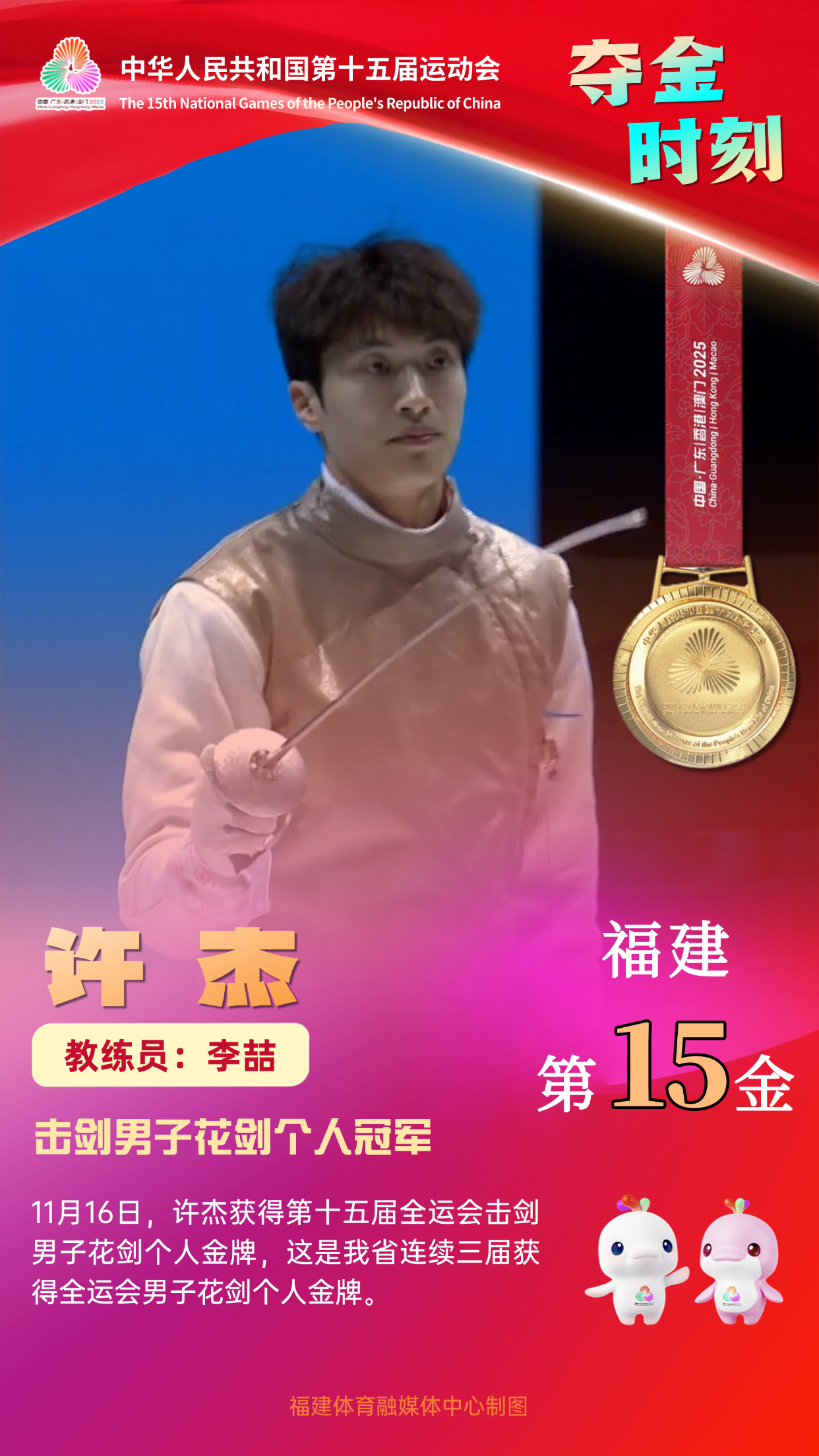 由泉州输送的运动员许杰,2002年1月出生,2017年2月进入省击剑队,曾获2023年米兰世界击剑锦标赛男花团体第二名、杭州亚运会击剑男花团体第二名、全国击剑冠军赛总决赛男花团体金牌、个人第二名,2024年亚洲击剑锦标赛男花团体金牌、全国击剑锦标赛男花团体金牌,2025年全国击剑锦标赛暨全运会预赛第三站男花团体金牌、个人金牌。