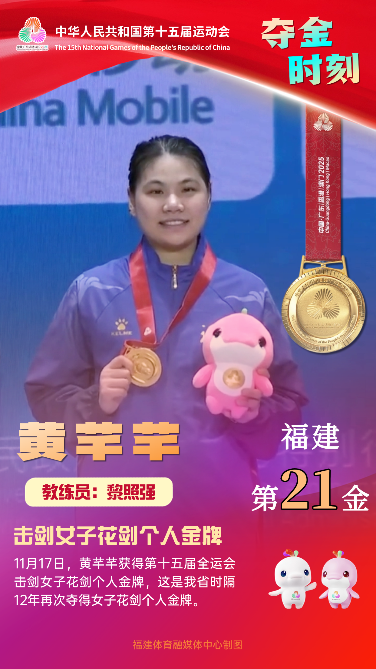 由泉州市输送的运动员黄芊芊,2002年2月出生,2018年3月进入省击剑队,曾获2023年杭州亚运会女花团体金牌和个人金牌、亚洲击剑锦标赛女花团体第二名、全国击剑冠军赛总决赛女花团体金牌和个人第二名、全国击剑锦标赛女花个人金牌,2024年亚洲击剑锦标赛女花团体第二名、全国击剑锦标赛女花团体金牌和个人金牌,2025年全国击剑冠军赛总决赛暨全运会预赛第二站女花团体金牌、全国击剑锦标赛女花个人金牌。