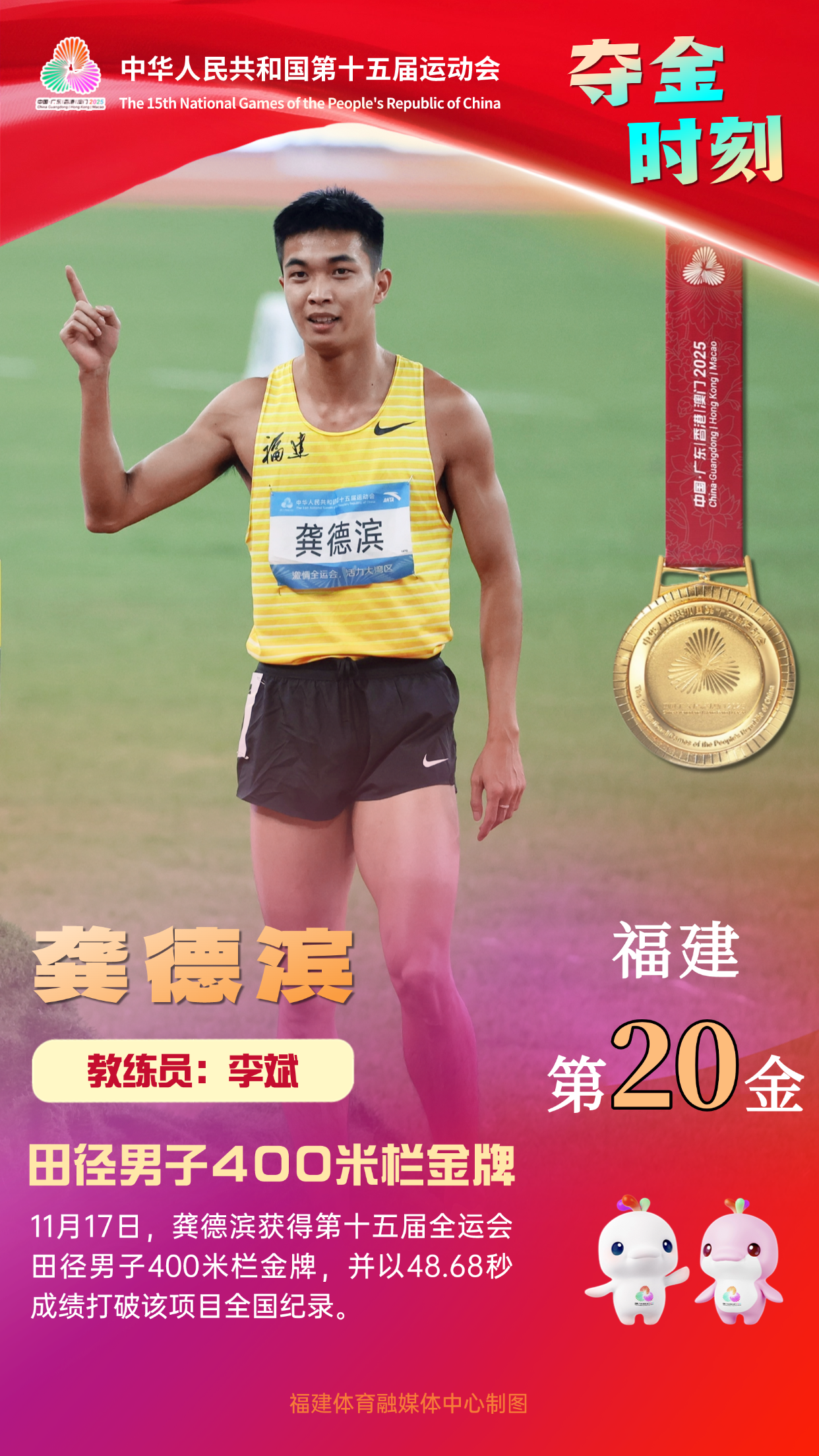 由厦门市输送的运动员龚德滨,1997年9月出生,2022年12月进入省田径队,曾获2023年全国田径冠军赛暨世锦赛及亚运会选拔赛男子400米栏第二名,2024年全国田径锦标赛男子400米栏第二名、全国田径冠军赛男子400米栏金牌,2025年全国田径锦标赛男子400米栏第二名、全国田径冠军赛男子400米栏第二名。