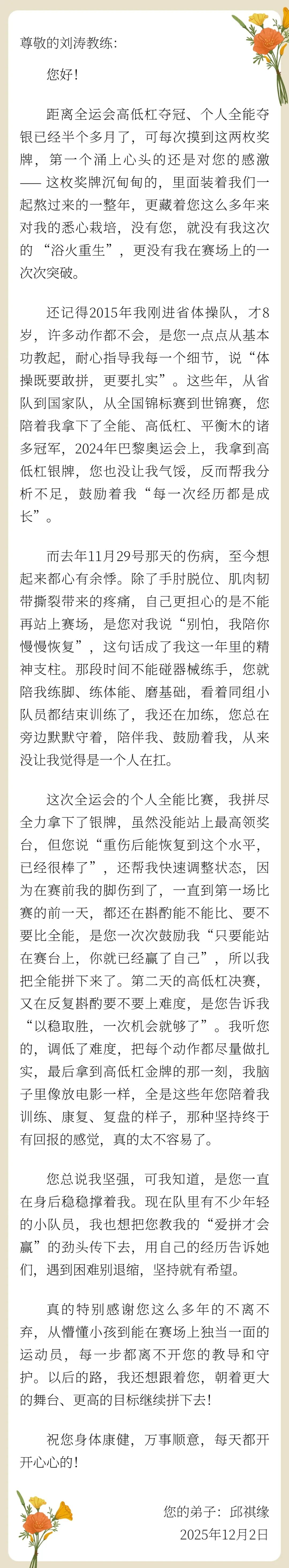 全运感恩・致教练 | 邱祺缘:2枚奖牌藏深情,感谢您陪我从伤病到夺冠